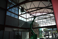 The installation posed many challenges toMITS Inc. and its crew; The network of steel beams meant we would have to move the lift several times and the exercise area pictured above was located under the first set of windows. We had to re route traffic and be careful of patrons too! Theheight also meant the bucket was going to sway, but thanks toSunbelt rentals we had the right tool for this job.