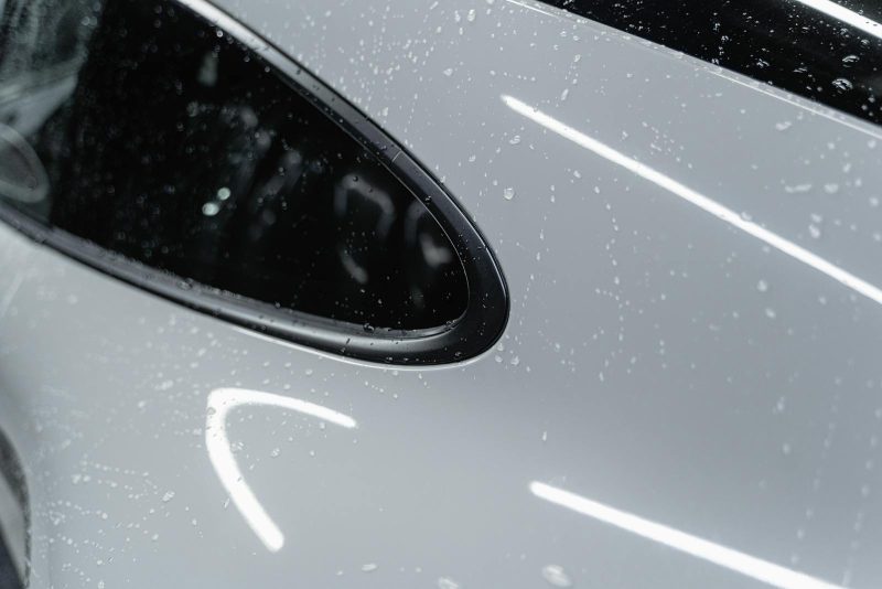 A detailed view of a white car with water droplets after a wash, showcasing its shine.